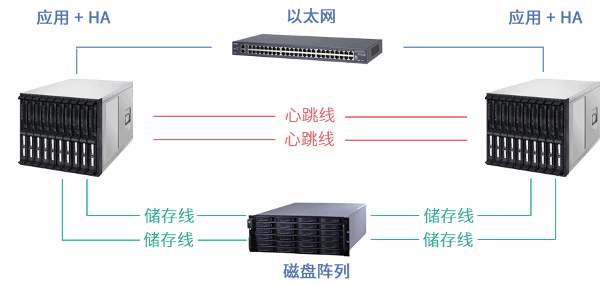 務(wù)器提供計算資源,兩臺存儲提供存儲資源,建立雙機熱備系統。