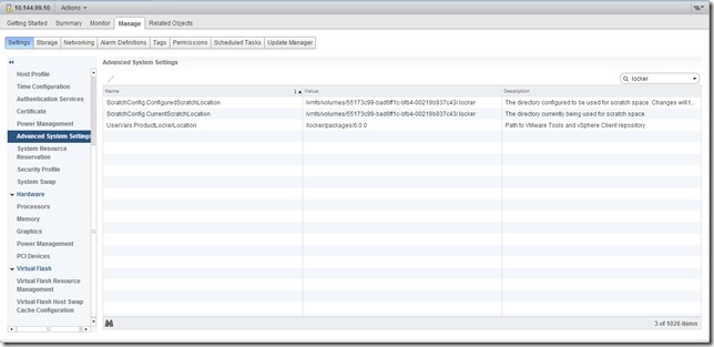 現在我們有了一個(gè)新的VMware Tools 文件共享位置,選擇一個(gè)主機,轉到Manage > Settings >Advanced System Settings > UserVars.ProductLockerLocation。