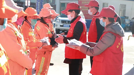 活動中,林芝市人社局黨組副書記、局長李培靈同志及黨員干部們?yōu)閲攮h(huán)保林芝分公司一線環(huán)衛(wèi)工人送來了絨手套、棉圍脖、保暖帽等物資60套。